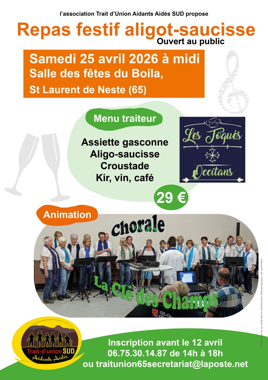 L'association Trait d'Union Aidants vous propose un repas festif; au menu Assiette gasconne , aligot saucisses, croustade kir vin café .